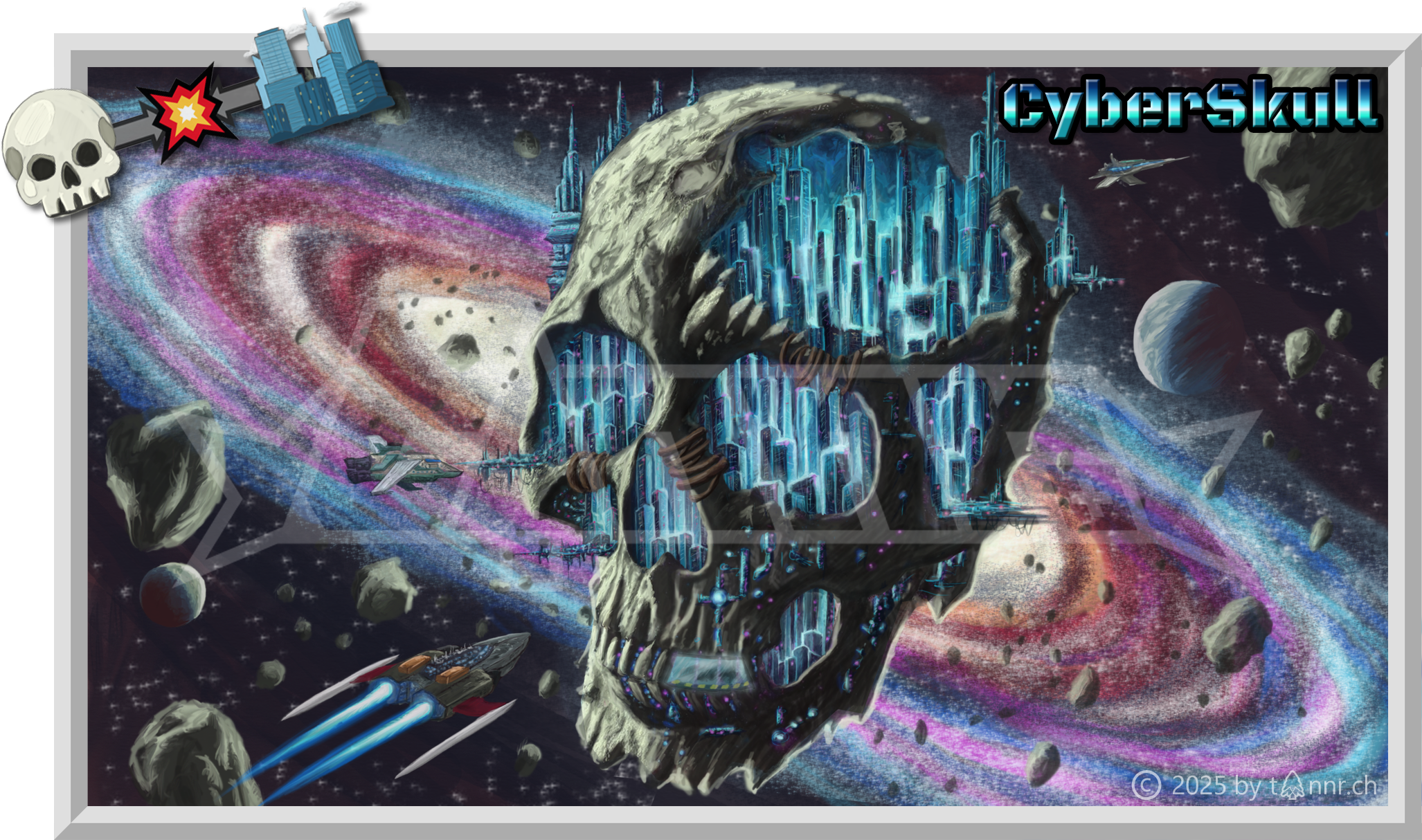 In dieser Variante wurde ein Skull (= Totenkopf) mit einer Stadt fusioniert. Um das Bild spannend zu gestalten, habe ich den Skull als Asteroiden gezeichnet und in den Schädel eine Cyberpunk-Stadt integriert. Für eine kleine Skizze wirkt das Konzept schon ziemlich gut – aber was meinen Sie?